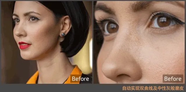 内置了包括Portrait、Dodge Burn 、Clean Backdrop等11个人像修饰插件,基本上涵盖了人像处理中的方方面面:光影、磨皮、去瑕疵、美白等效果一应俱全。