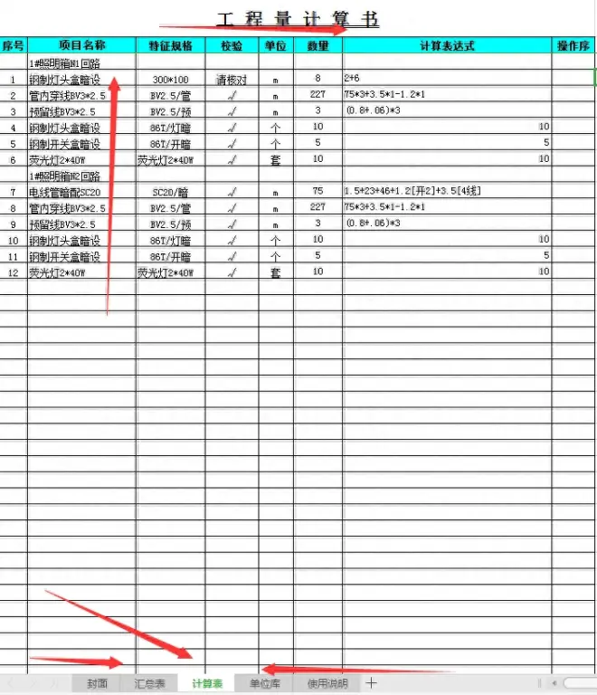 1、计算工程量前,肯定要进行熟习图纸(高手除外)和收集相关的图集资料。此时可以打开《汇总表》把图纸上所涉及到工程量计算的工程项目一一罗列出来,当然不用先急着计算工程量,但可以套上定额编号或清单编码,套上定额编号或清单编码后,表格自动编序号。对于直接可以清点出工程量的少量工程项目,如配电箱等可以将工程量直接写入汇总表。