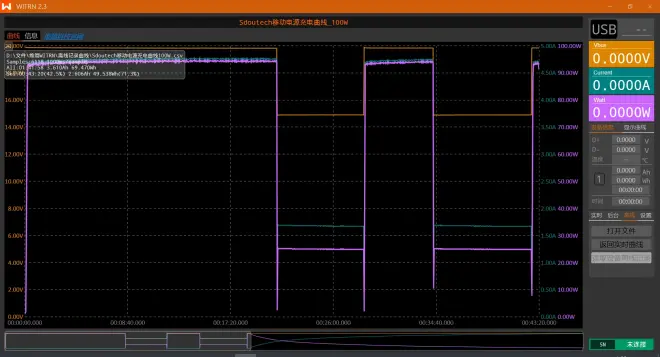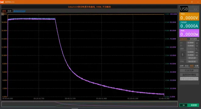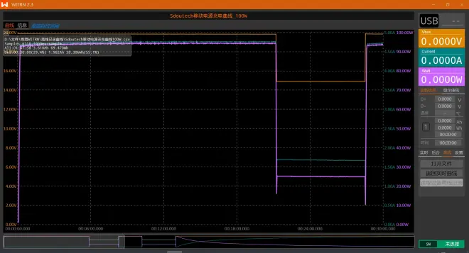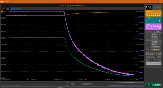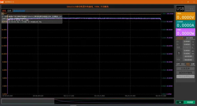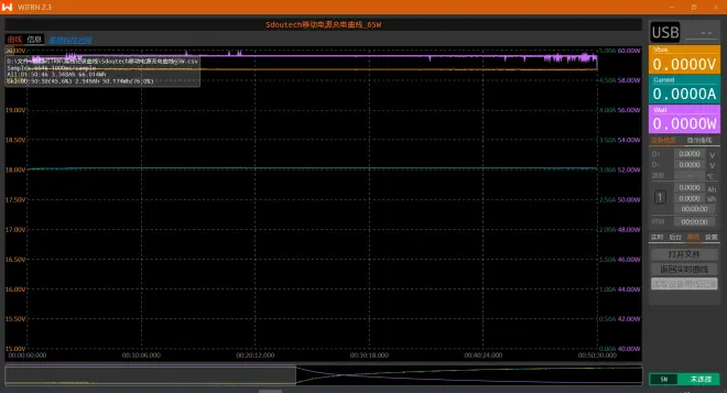 换用小米第一代65W氮化镓充电器(AD65G),在相同条件下为移动电源充电(无主动散热),全程用时1小时51分钟,充电曲线如下