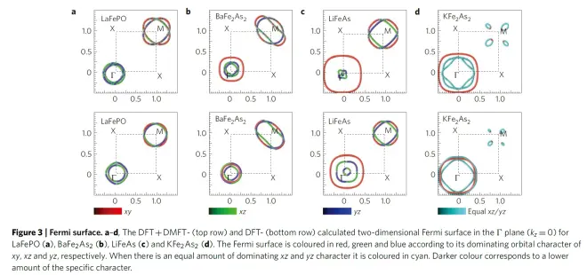 Fig. 3 中,DFT+DMFT的结果和实验更吻合,比如看点,(b)图和(c)图,xy轨道的pocket应该在外,然后再看(b)→(c),xy口袋grow,xz/yz口袋shrink,这和Fig. 2b给出的电子轨道transfer相吻合。值得注意,KFe2As2的(d)图,