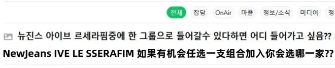 前两天韩网论坛一则帖子发问:“NewJeans IVE LE SSERAFIM 如果有机会任选一支组合加入 你会选哪一家呢? 假设你的年龄颜值实力都不违和...”