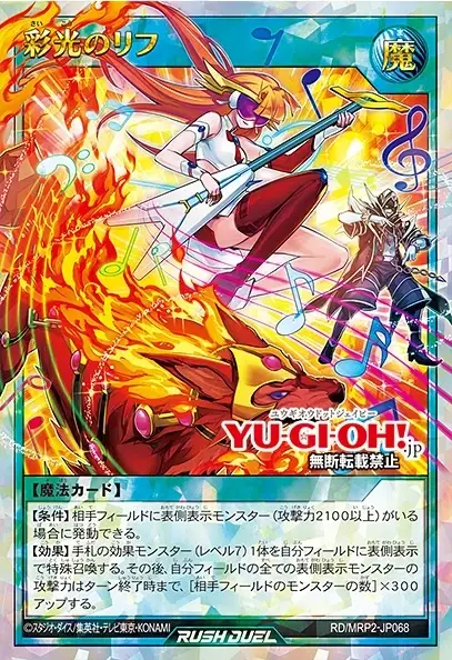 「彩光之连复段」,罕贵是ORR,通常魔法卡。适合效怪(7星)浓度高的卡组,合计省1解放素材+自己全场飚300N,可以调整展开顺序,尽量吃满300N。效果很契合剧情,怪兽(攻击力2100以上),此时对面是游我的「七星道魔术师」(2100攻),效果怪兽(7星),「彩光之首席女吉他手」(效怪7星),此卡的飚攻效果就是彩光的飚攻效果。卡图里的是「彩光之首席女吉他手」「暗黑巫师」和「魔兽 钨狼」;卡图对应7代动画第3集 游我打露明 露明用的卡组是游我借的卡组加上彩光 对应卡图里的3只怪兽都是露明方的 卡名对应该集露明的台词。