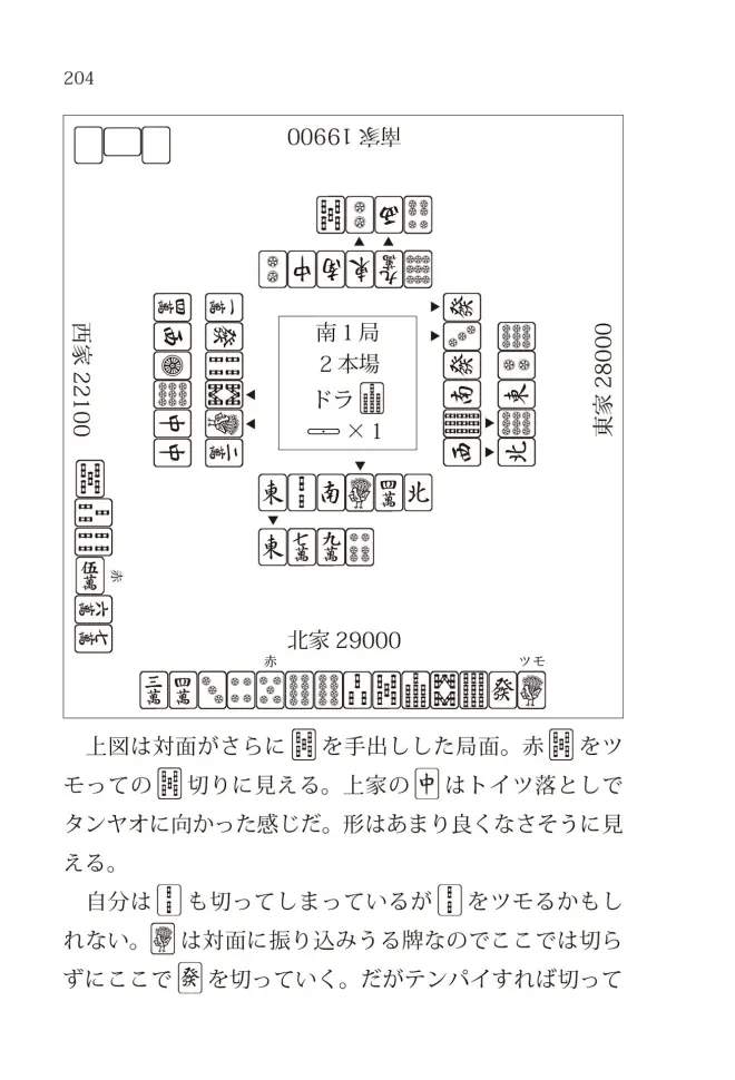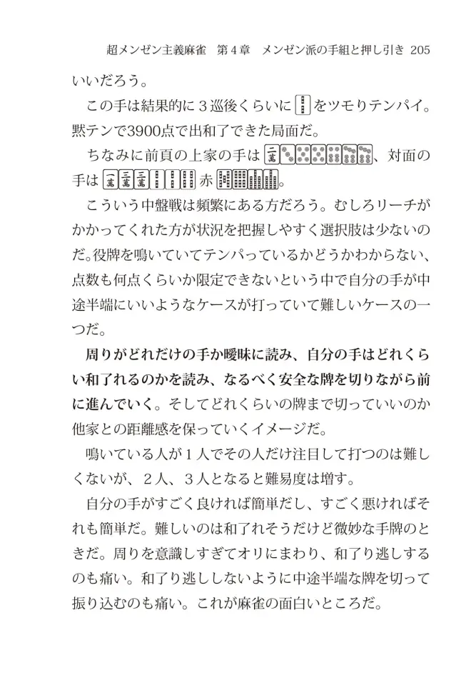 模糊读牌,感受别人的手牌可能的形状,读自己的手牌的和率大概还有多少,尽量一边切着安牌一边前进,同时也要思考切到什么程度才好和别家保持住距离感。