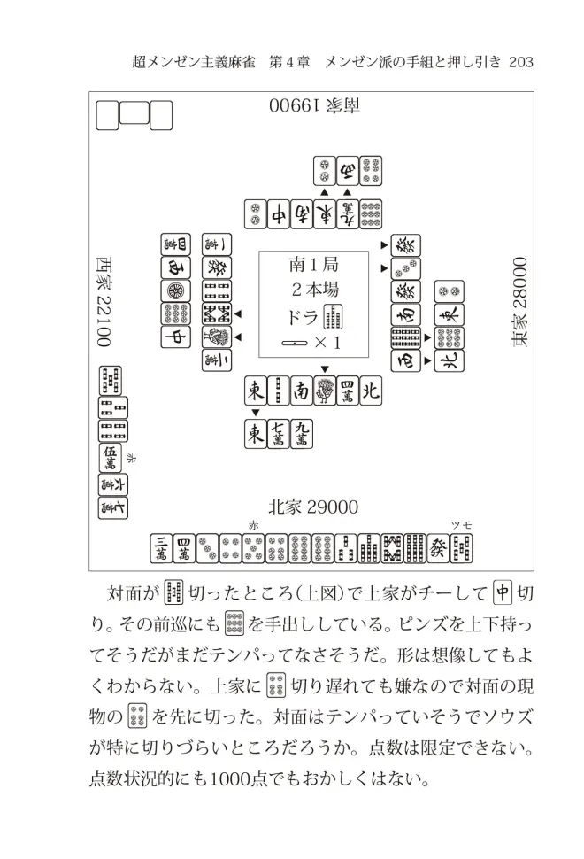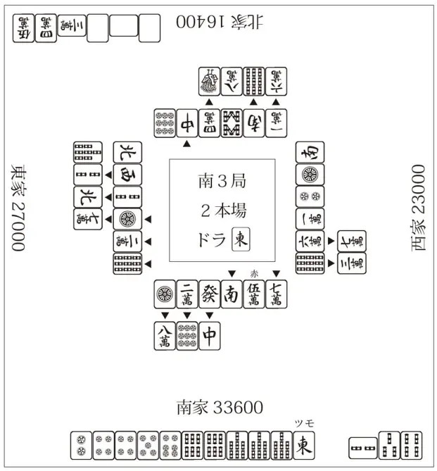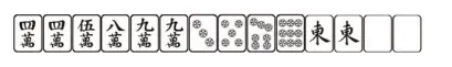 或许也有人会在这种形状中高明的先切4m。以为自己已经读明白对家之前的手摸切,想着在这种点数差距下仍然切东然后边喊“爆牌!”,从而让人觉得自己在麻将上近乎神技。不过说到底,对于自己读牌要信任到多少程度本身就难以断定,被用意想不到的形状鸣牌也会让人头疼,所以我想这里还是不能切东的吧。实际上对家的形状是: