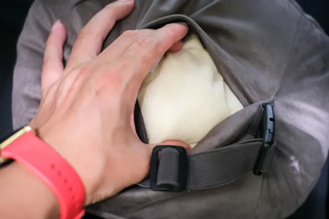 头枕的麂皮绒外套背面设计了隐藏式魔术贴,撕开之后,可以将内芯取出。不管是内芯,还是外套,都是支持水洗的,这一点必须好评。