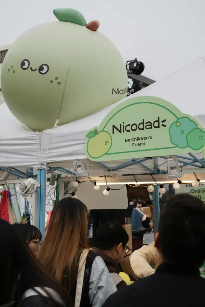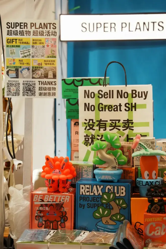 刚开始逛,我们就被一颗“坐”在帐篷顶部的大苹果吸引了过去,走进一看发现是「Nicodad尼可爸爸」鲜果护肤的摊位,这样的装置十分有意思,直勾勾的吸引眼球;门口被粉色和流行短语充斥的是「有钱花店」,是专注于“梗”文化的原创设计家居品牌「左咸墩道」的摊位,我曾在他家的网店购买过地毯,上面写着“把所有烦恼都留到门外”,能够在线下遇到关注的网店还真是有趣;也遇到了小红书特别火的「SUPERPLANTS 超级植物」,一个相信植物有魔法的品牌,用植物让我们和生活发生更多的关系和羁绊……