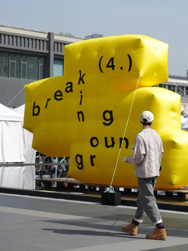 到达目的地,穿过充气拱门,我们人手一个领到了逛集指南和入场礼——与这次市集活动设计元素统一的限定贴纸套装。随之而来的是一个明黄色的异形「Breaking Grounds⁴」气模装置,充满活力的黄在第一时间吸引了大家的目光,为天气和心情都增添上了一抹亮丽的色彩,几乎所有人都会选择停在这里拍照打卡。