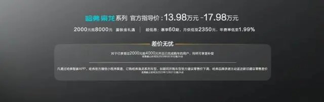 并且在本次重庆车展现场,哈弗品牌带来了全新的销售政策,即日起至6月30日晚24点完成并购并开票,即可享受2000元抵8000元膨胀金礼遇;对于已享受过2000元抵4000元并且已完成购车的用户,同样可享受补偿。另外,自即日起至2023年12月31日,凡通过哈弗智家APP/哈弗官方微信小程序渠道订购哈弗枭龙系列车型用户,如期间所购车型官方建议零售价下调,哈弗品牌承诺主动返还新旧建议零售差价。