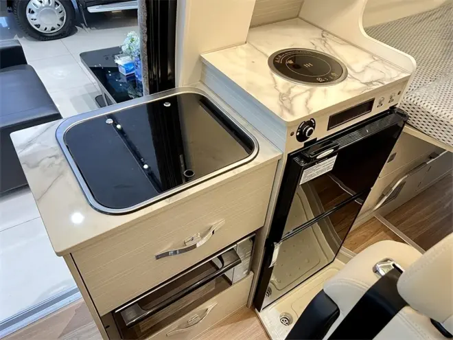 厨房区域设计在车辆侧滑门旁,便于车内外使用。厨房区域配备了85升房车专用冰箱、翻折式扩展台面、平板式光波烤箱一体微波炉、镶嵌式电磁炉及带盖水槽,带来了完整的烹饪体验。