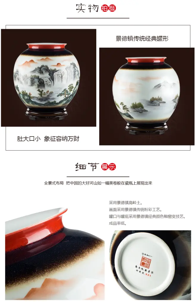 《江山如画》粉彩好运罐,全景式布局,把中国的大好河山如一幅美卷般在瓷瓶上展现出来。采用景德镇高岭土,画面采用景德镇传统粉彩工艺,罐口与罐底采用景德镇经典颜色釉窑变技艺,成品率低。