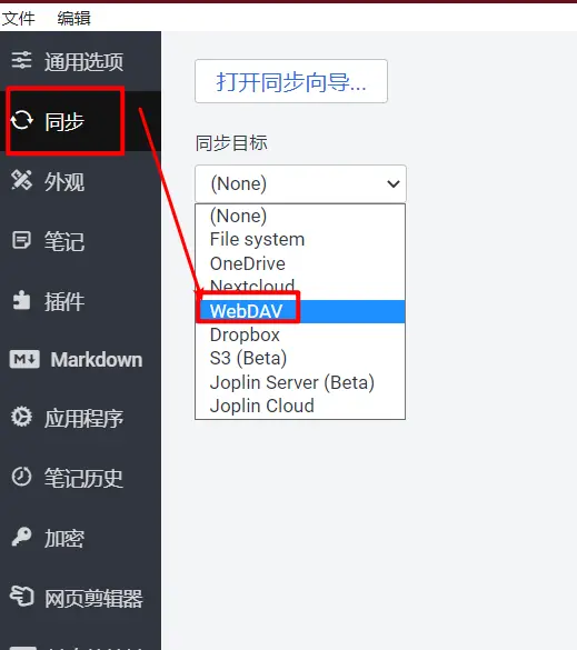 打开Windows版本的Joplin:依次点击工具——选项——同步,然后选择同步目标WebDAV