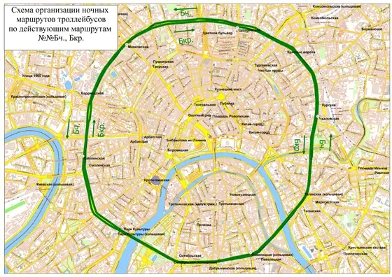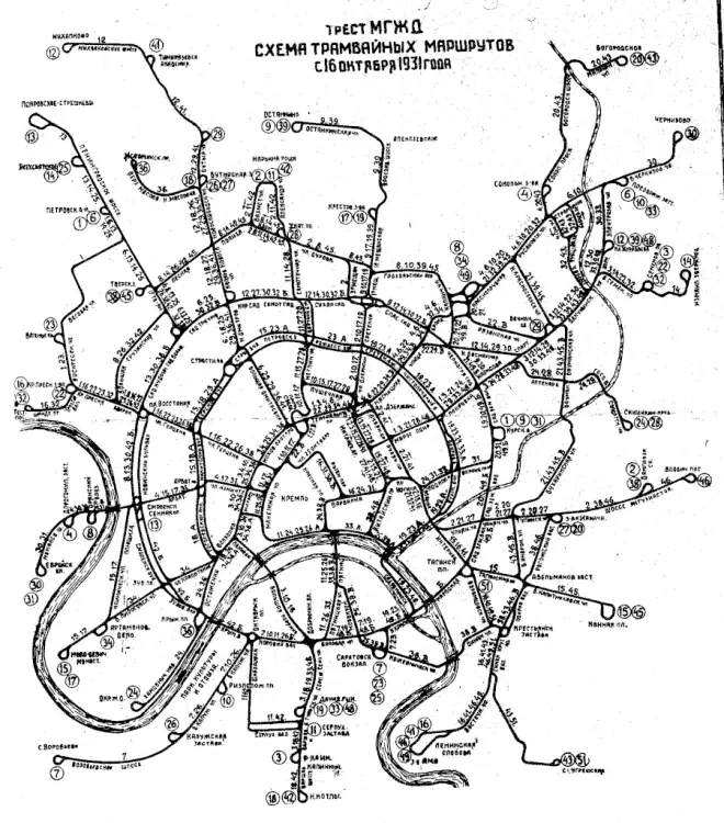 沿着莫斯科花园环路运行的公共交通线路。1912年以前:有轨马车。随后是有轨电车。