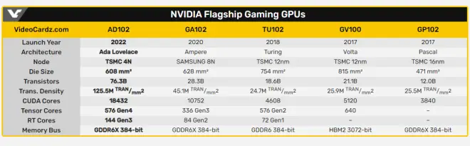 继续比较Ada和Ampere GPU,它们是GeForce RTX系列的旗舰处理器。采用4nm工艺技术打造的Ada处理器拥有18432个CUDA内核,晶体管数量是8nm工艺GA102的2.7倍。尽管进行了这些升级,GPU实际上还是小了20平方毫米。