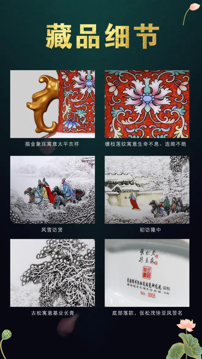 三顾茅庐抱月瓶是一件制造规整的大器,唇口微外撇,直颈,颈肩处饰一对描金象耳,腹中部凸起,椭圆圈足;纹饰非常清晰,腹部中心为张松茂创作三顾茅庐粉彩雪景,大面积采用缠枝纹作装饰,足脚为回龙纹粉彩雪景,色泽艳丽,色彩明快。