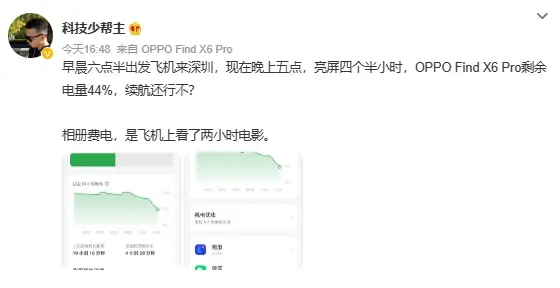 另外我看博主和一些用户评价,也是说续航还行,一天一充基本没问题,像 @科技少帮主 就说亮屏四个半小时,OPPO Find X6 Pro还剩余44%电量,按照这个情况估计总亮屏时间应该可以到八小时左右,日常够用了。#畅聊数码新品#