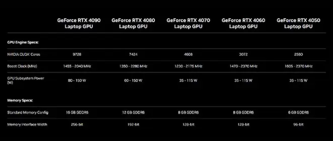 与面向高端的RTX 4090/4080 Laptop GPU相比,RTX 4070 Laptop GPU的定位更接近主流市场。特别是规格参数方面,与上一代RTX 3070 Laptop (5120个CUDA核心、256-bit显存位宽)更靠近RTX 3080 Laptop(6144个CUDA核心)不同,RTX 4070 Laptop GPU(4608个CUDA核心、128-bit显存位宽)的规格更贴近主流市场,与高端的RTX 4080 Laptop(7424个CUDA核心、192-bit显存位宽)之间差距巨大,之间应该还会有其他型号来填充。对于RTX 4070 Laptop GPU,预计将与RTX 4060 Laptop一起,肩负起覆盖万元以下主流游戏本市场的重任。