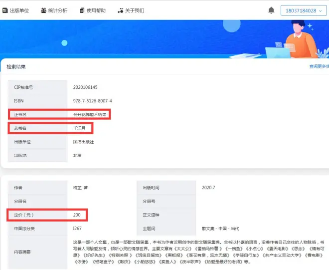 在我国,无论是单书号还是丛书号,都有唯一对应的一个CIP号,用以登记备案图书,且这个编号可以在“中国国家版本馆-国家版本数据中心”查询到图书的备案信息,以此来验证图书的真伪。CIP号一般印在扉页的背面上部,CIP并不是单独的一个编号,其所包含的有图书的相关信息及对应代码。