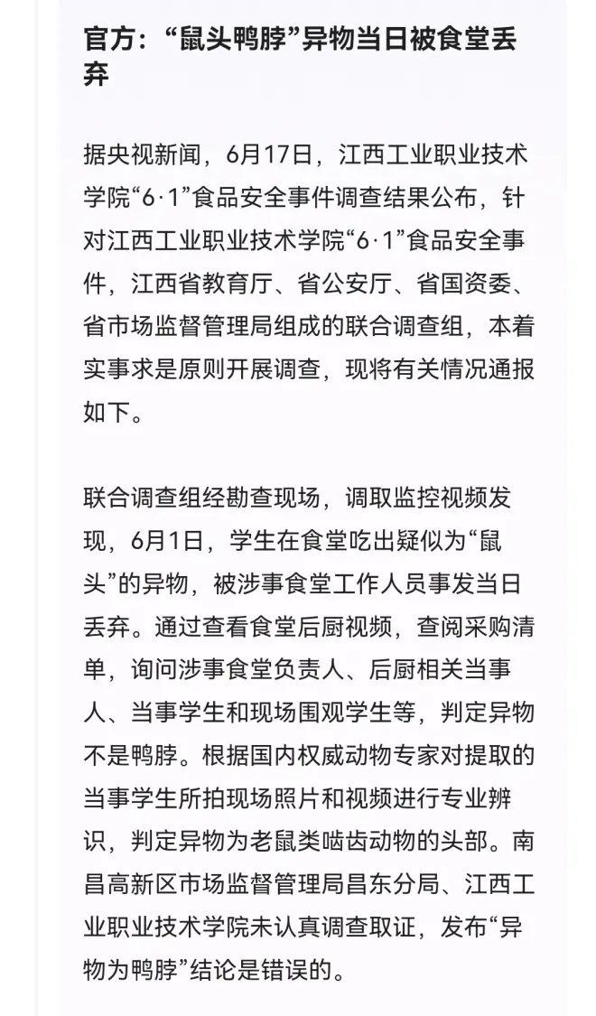 江西省联合调查组:异物为老鼠类啮齿动物的头部,不是鸭脖!