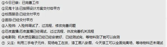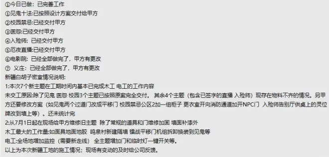 没想到啊没想到 乌鲁木齐项目到现在居然还没有彻底的完工。小雾可真是急死了,什么?皇帝不急太监急?谁说的给我出来! 小雾还是想跟大家说一下,我们在密室建造最后的收尾工作中出现的这些一系列小问题是如何解决的。 其实整体上我们项目基本上是已经完工了的,目前没有做完的工作主要是集中在甲方,对于现场的一些流程和道具布置上的小改动,虽然初心就是为了玩家们能够有更好的游戏体验,但是这些改动真的还是有点让小雾们死去活来。因为很多东西其实都是已经固定好了的,再去更改它的造型,其实是比较麻烦的,不过为了玩家们的体验,甲方爸爸们和我们也是豁出去了,即使牺牲一部分的工期,也要交出100分的答卷! 那么在这些小改动上面,肯定会出现非常多的问题,那么我们就会在现场将这些问题统一的整理出来,而不是做着做着发现一个问题再去解决,做着做着再去发现问题再去解决,这样的话不仅效率十分低下,而且时间根本不够我们去浪费,所以我们都会统一去汇总,并且将今天完成的所有内容进行总结,再计划明天要去进行的工作内容 希望乌鲁木齐项目能够尽快的结束,不能辜负小伙伴们的期待,也希望大家能够尽早的玩到这些好玩的主题。那我们今天的内容就先到这里,我们下期再见!