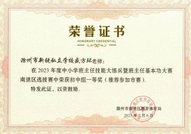 近日,新锐中学班主任教师代表盛方环、马达川、马从超三位老师在2023年度中小学班主任技能大练兵暨班主任基本功大赛南谯区选拔赛中均荣获一等奖。