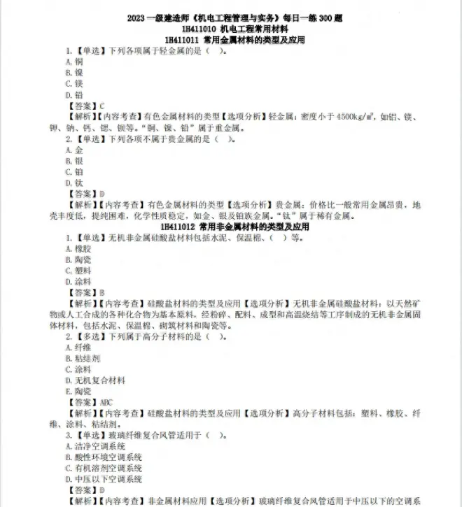 所以,苏婷老师通过对近几年的真题研究,给大家总结了一份一建机电考前必刷的300道母题,每道题的含金量都很高,里面包含了考试的常考知识点,相当于边刷边记,让你更加高效的备考。