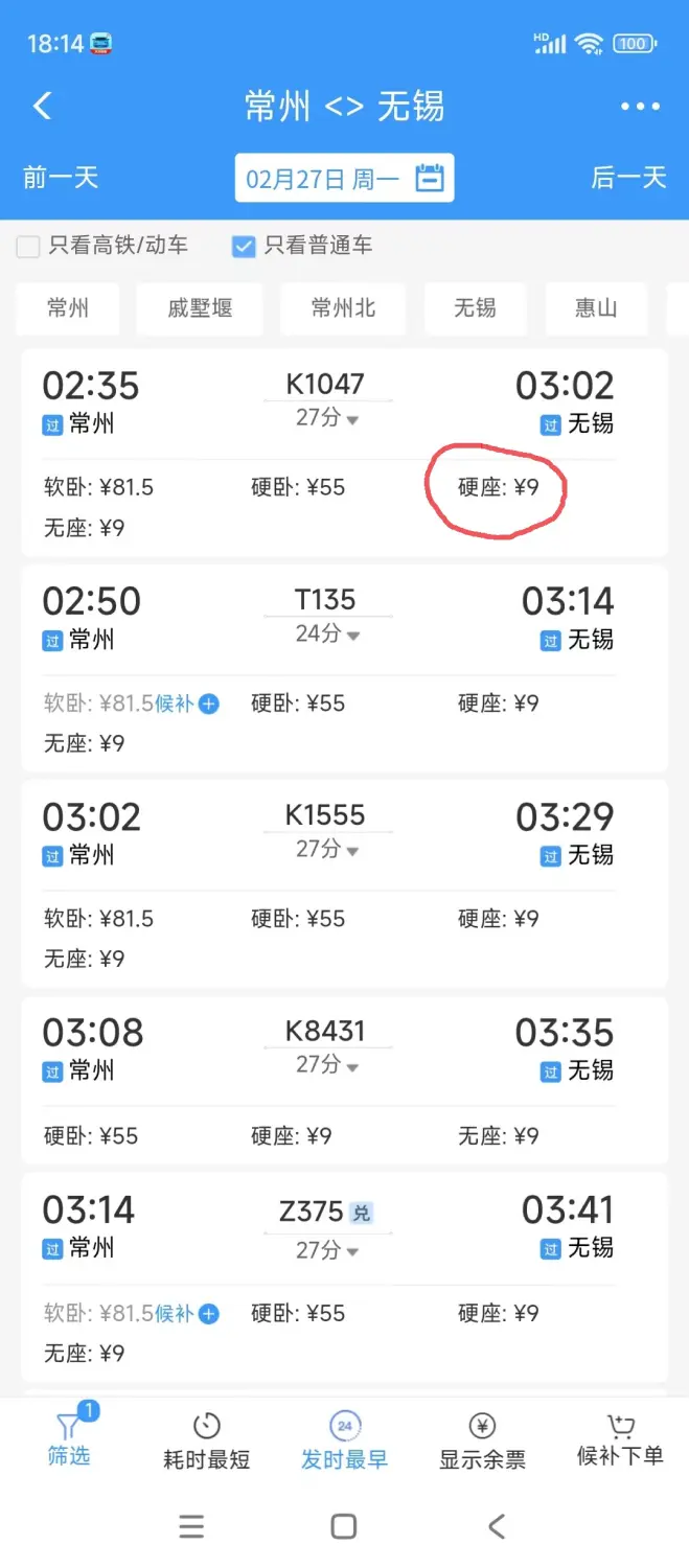 很正常,这就是一般的高铁车次,只是票价进行了折扣优惠。自从铁总开始搞浮动票价后每年都会有票价打折的列车,尤其是春运时,从1折到95折不等,弄得也乱七八糟的。我知道的像20年春运武昌-温州的K4505,全程硬座15元;还有22年春运时的K1047,票价最低1折优惠,硬座一站1元起步,软卧一站15.5元起步,跟普客小票车一个价。我还收藏一张22年1月27日的K1047次,从常州到无锡新空硬座票价1元,而在正常情况下,票价是9元。