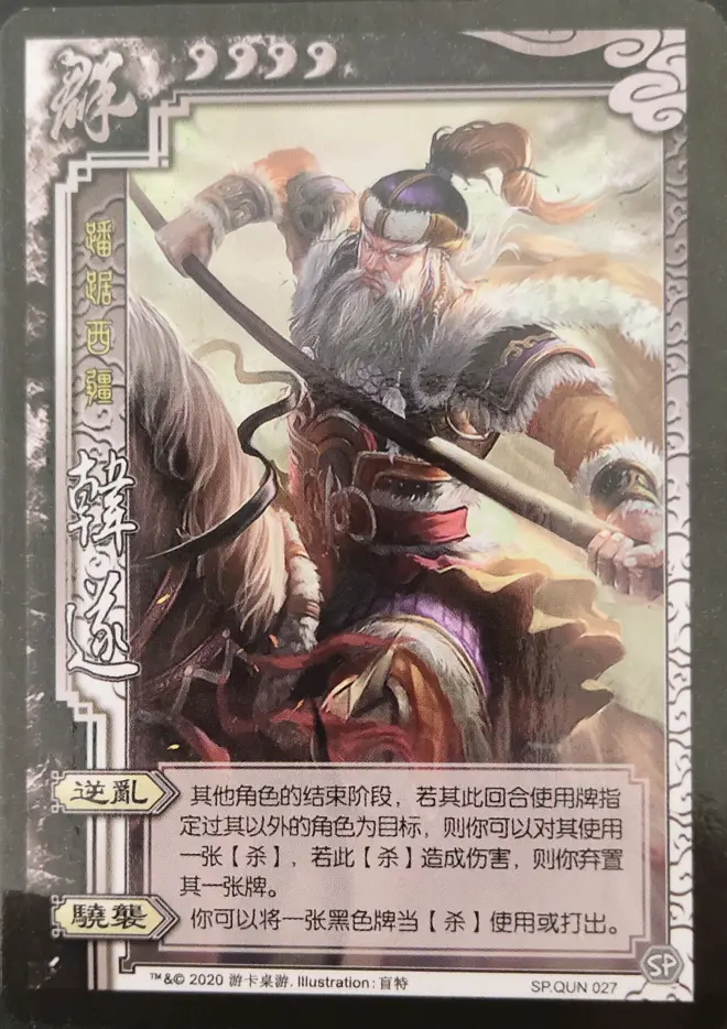 这个也是有两个版本的将,这个版本说实话并不强,首先其没有过牌,其次其没有强命,再者即使技能发动收益也不高,在连弩加持下可能有一定的输出能力但是基本上也是初代关羽的水准了,关羽红牌当杀他黑牌当杀本质上没什么区别,甚至某种意义上来说黑牌当杀可能更弱,毕竟黑牌大多本身就是进攻性的牌变成杀反而降低或持平其本身效果基本就更是添头中的添头了。一技能命中后也就弃置一张牌而且这张牌大概率还命中不了所以真的时代的眼泪都称不上。