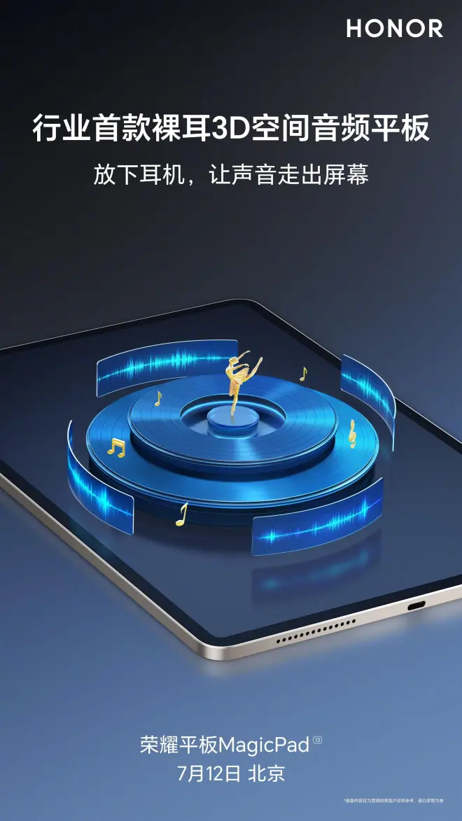 荣耀新旗舰平板MagicPad又爆新消息,音乐发烧友们有耳福了!7月10日荣耀官方宣布,荣耀平板MagicPad 13将成为行业首款裸耳3D空间音频平板,带来“好声场,如在现场”的绝佳音频体验。