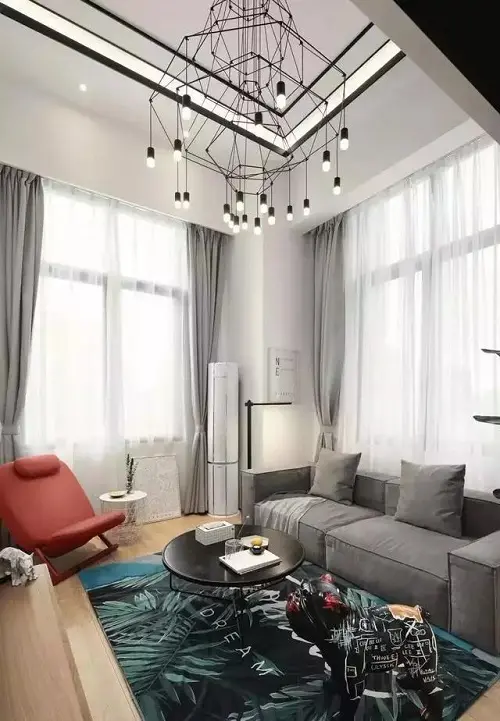客厅处做了挑高的设计,顶部的跌级吊顶加上了藏光,还做了几圈的装饰线条,搭配几何造型的创意吊顶,显得非常的帅气。