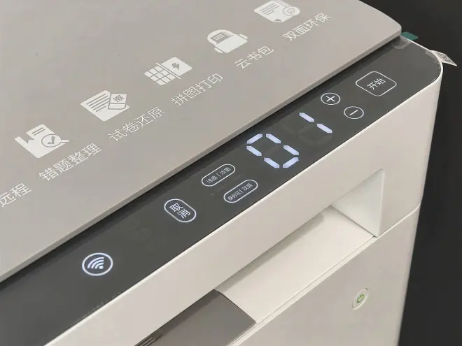 盖板旁边的黑色条状区域是隐藏式触控操作面板,可以对墨迹、证件、复印张数进行选择,较少的选项加上中文标签让操作变得也简单。面板旁边的wifi标识,也说明它是一款智能打印机,可以通过APP或小程序进行远程控制打印等操作,不在家也能提前帮孩子打印好资料。