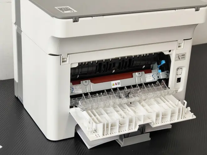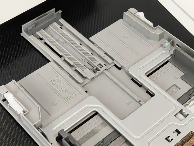 底部是进纸托槽,可以直接抽出机身外,装纸更为方便。它最多能装150张80g的A4纸,对于家用来说足够大,免于频繁装纸的操作。