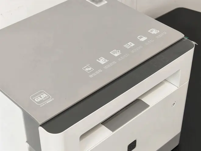 从外观来看,它跟传统的激光打印机样式差不多,不过体积要小一些,显得更为精致。接近正方体的外形搭配圆润的边角,整体看起来比较优雅,而且白灰的配色也大方,跟家居环境比较协调。