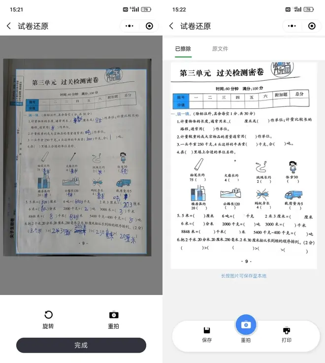 其次是试卷还原功能,一键把做过的试卷还原成空白试卷,很适合喜欢乱涂乱画的小朋友使用。新试卷让他可以再做一遍,也帮助他改掉乱画的小毛病。