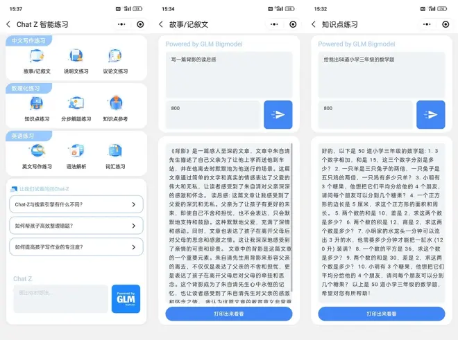 第三个功能就是Chat Z,它是智能练习AI助手,紧跟大语言模型潮流,采用一问一答的形式辅导学生针对性的练习重点学科知识。可以答疑解惑,也可以根据薄弱点给出相关题型,并且能随时打印或者放至云书包中,让学习也能变得智能起来。