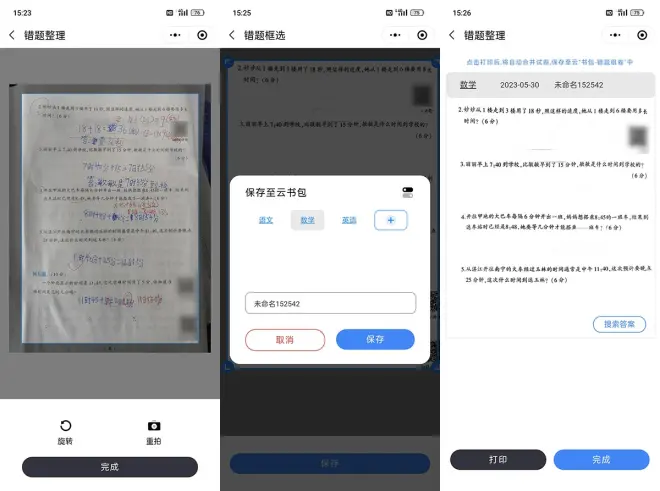 学习方面主要依托小程序使用,首先是错题本功能,只需要用手机拍下答错的题目,就能擦除答过的笔迹并智能识别出题干部分。然后我们就可以把它加入云书包中,在这里可以对错题分学科整理汇总,平时就能拿来复习巩固。