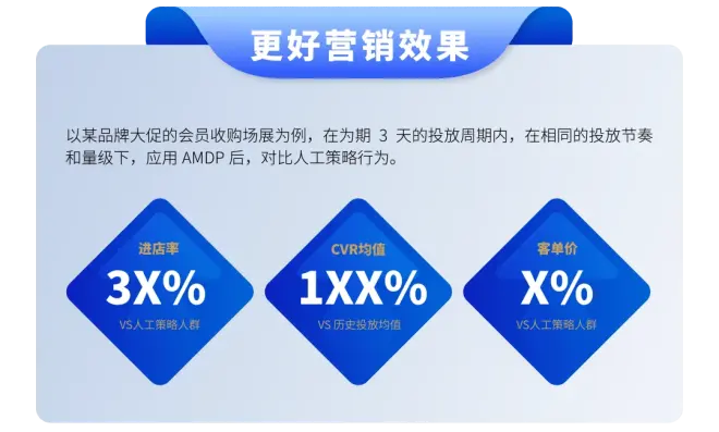 以某品牌大促的会员收购场景为例,在为期3天的投放周期内,在相同的投放节奏和量级下,应用AI MDP后,对比人工策略行为:在进店率、CVR均值、客单价等方面实现提升。