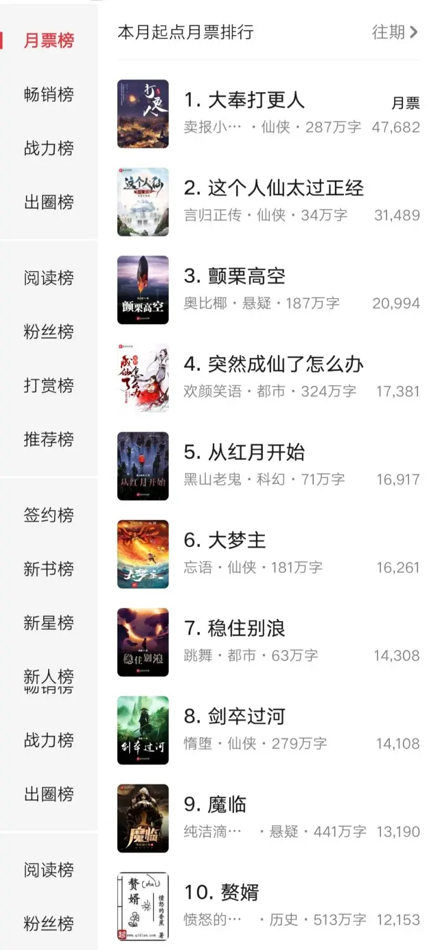 时间是周末,我们继续盘点这一周的起点资讯。之前说过新书上线、精品小说完结,最后我们再来看看很多人都关心的月票榜变化。