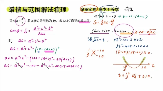 - 余弦定理:一角三边;平方和、边之积或和;完全平方;基本不等式