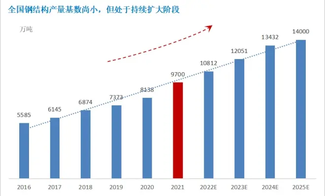 据《钢结构行业“十四五”规划及2035年远景目标》(以下简称《规划》),十三五期间,钢结构行业发展得到稳步提升,我国钢结构产量从5100万吨增加到8900万吨;钢结构产值从5000多亿元增加到6000亿元以上。