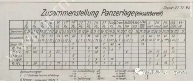 *号主注1:还有一份报告显示第6装甲师即使在多日后的12月22日,保有坦克数字比21日雄厚,达9辆短三,15辆长三,7辆长四。长管子数量不算少!而且此表格没计算二号和指挥坦克。而根据引用NARA的冬季风暴一书中,23日第6装甲师的战备坦克甚至恢复到了31辆三号和10辆四号(绝大多数是长管)而且21日后各个装甲师的坦克数字都不存在二号的上报,并不是没有战备的二号而是没上报。