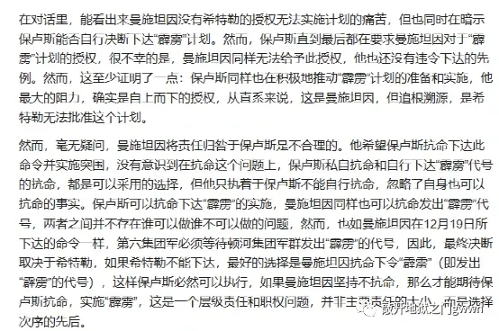 我一直以为在上一篇专栏中我已经从微波炉的角度,从曼施坦因角度,从蔡茨勒参谋长角度已经将买飞蛾,保卢斯,okh,曼施坦因之间的关系梳理过之后,至少能让大部分人明白一件事,即曼施坦因是整个冬季风暴期间权力最小甚至只有按照他承诺解围那部分权力的人。但是就目前来看,有一篇新的文章以及一些观点德出现。在这种情况下,我不得重新再做一篇分析,因此本文才会出现。当然关于指挥权上的问题在上一篇文中我已经详细记述和分析,故不做太多额外阐述
