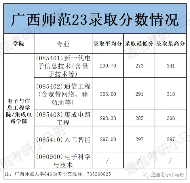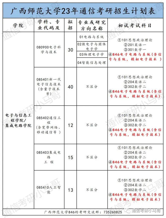 广西师范大学2023年一共有5个专业方向招生,都来自电子与信息工程学院/集成电路学院,分别是080900电子科学与技术(学硕),085401新一代电子信息技术(含量子技术等)(专硕),085402通信工程(含宽带网络、移动通信等)(专硕),085403集成电路工程(专硕),085410人工智能(专硕)五个专业。初试专业课均为846电子电路与系统(含信号与系统,模拟电子技术)。其中学硕专业初试考数一/英一,专硕都考数二/英二。