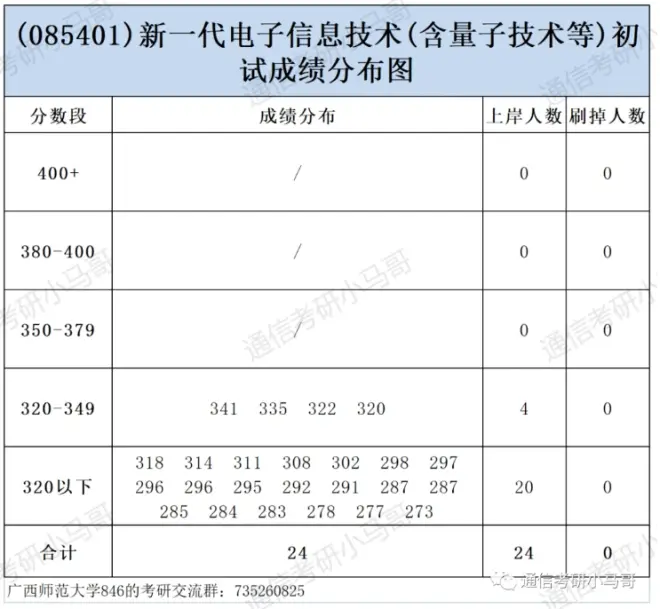 ①由上面的分数分布可知报考广西师范的同学分数都不高,分数都普遍在320分以下,高分较少,其中报考(085401)新一代电子信息技术(含量子技术等)的同学较多,而其他专业的报考人数极少。