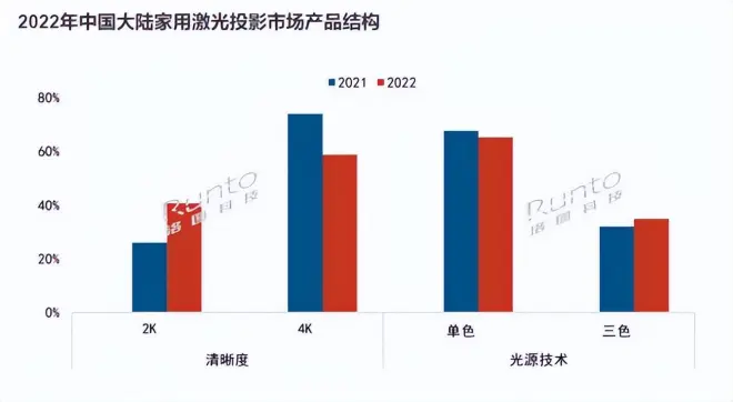 根据洛图科技(RUNTO)的数据显示,2017-2022 年,国内家用激光投影市场的复合增长率达到了44%,而随着坚果投影和海信Vidda旗舰产品的销售,三色激光投影的份额提升到35%。在业内看来,三色激光投影的市场份额增加是必然的,因为随着用户的消费水平提高,大家对家电的品质要求也会提高。