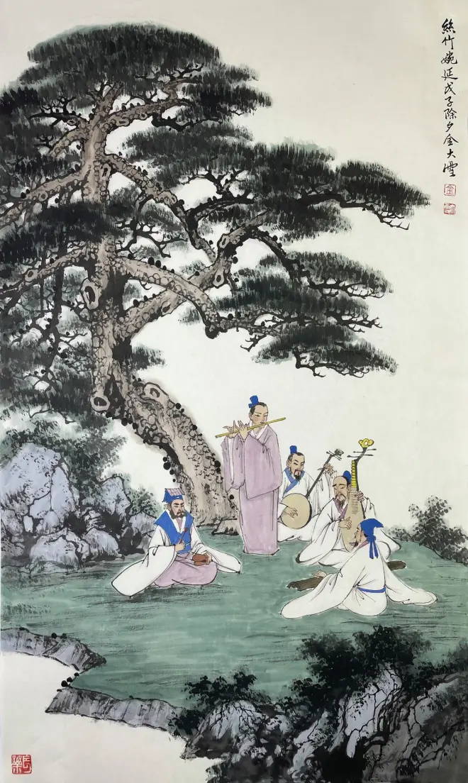 金大雪的绘画代表了学院式新的文人画的表现方式,他的作品中更多地展现了传统笔墨和文人的风格。他挖掘了传统题材,在他的作品中洋溢着古意,其山水不仅追求着魏晋时代的氛围,还向历史人文致敬。他将绘画与文学典故相结合,使得作品中既有引人入胜的故事情节,又能给人以亲近感。金大雪的绘画具有新意,他主要通过题材与表现语言的结合来实现大众性,他的作品融合了中国传统插图和连环画的叙事方式,同时又带有文人的气质,可以说是雅俗共赏。通过金大雪的绘画,我们可以看到他对魏晋时代风骨的回顾,并展示了传统文人画在当今时代的拓展可能性。
