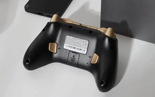 手柄背部采用的是硬质磨砂材质,且左右握把设计有有北通品牌防滑纹,握持手柄时能最大程度地提供稳定性,保证在激烈的游戏中不会因为频繁的操作的而出现手柄脱落的现象。此外,靠近握持把手附近设计有两颗背键,按键面积较大,手感偏硬,日常使用时不容易误触,两枚按键均可进行映射、连招宏、连击等自定义设置,是一款实实在在的游戏手柄。中间靠下方预留有USB接收器的收纳仓。