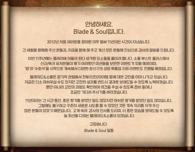信件的内容大致讲述;剑灵已经运营11个年头了感谢大家的陪伴一大筐废话,重点是玩家提议了新手/回归玩家在封魔版本很难起步,然后棒子也听进去, 但是他不是白送了通过一些活动开放成长概率支援活动让你提升(也就是还是要氪金/或者你白嫖活动存材料等活动开了冲一波)这次11周年从灵核和守护石开始。其他都是废话,具体活动等12号和19号开放后再行爆料