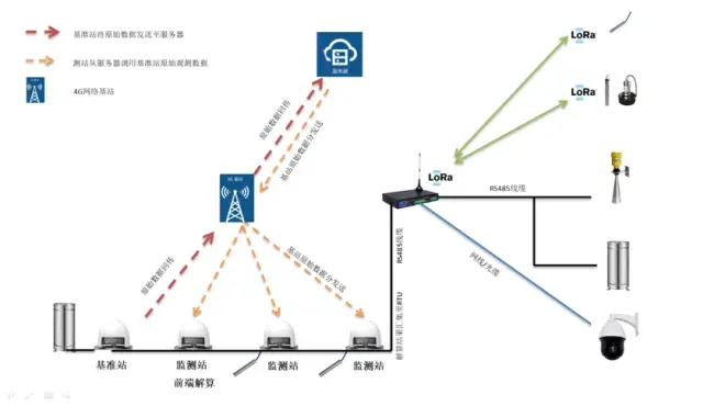 2、 感知层:感知层主要包括GNSS基准站和监测站,由GNSS接收机、GNSS天线、观测墩、避雷设施等组成,GNSS基准站主要提供变形基准,安装在稳固的基岩上,监测站主要用来监测坝体的形变,部署在坝体上,GNSS监测站与基准站可通过向后台传输原始数据进行后端解算得到变形结果,也可由监测站直接通过LoRa/WIFI无线组网或光纤/RS485有线组网调用基准站观测数据实现本机前端解算获得变形结果。