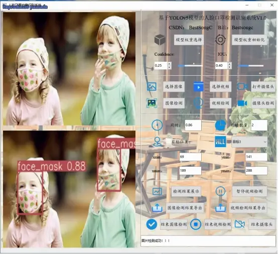 摘要:基于深度学习的高精度人脸口罩检测识别系统可用于日常生活中或野外来检测与定位人脸口罩目标,利用深度学习算法可实现图片、视频、摄像头等方式的人脸口罩目标检测识别,另外支持结果可视化与图片或视频检测结果的导出。本系统采用YOLOv5目标检测模型训练数据集,使用Pysdie6库来搭建页面展示系统,同时支持ONNX、PT等模型作为权重模型的输出。本系统支持的功能包括人脸口罩训练模型的导入、初始化;置信分与IOU阈值的调节、图像上传、检测、可视化结果展示、结果导出与结束检测;视频的上传、检测、可视化结果展示、结果导出与结束检测;摄像头的上传、检测、可视化结果展示与结束检测;已检测目标列表、位置信息;前向推理用时。另外本人脸口罩检测识别系统同时支持原始图像与检测结果图像的同时展示,原始视频与检测结果视频的同时展示。本博文提供了完整的Python代码和使用教程,适合新入门的朋友参考,完整代码资源文件请转至文末的下载链接。