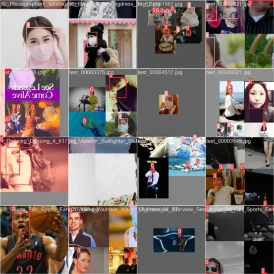 下图展示了本博文在使用YOLOv5模型对人脸口罩数据集进行训练时候的Mosaic数据增强图像。